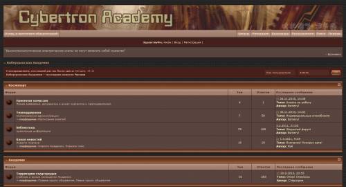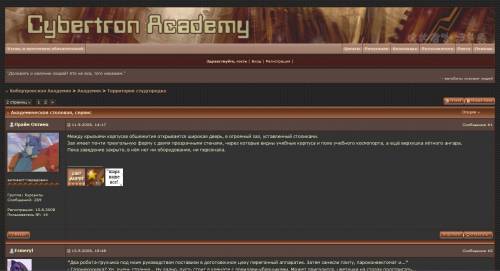 Описание: Мы ищем трансформеров с буйной фантазией и желанием учится или учить самому. Основная цель этого проэкта - систематизировать и понять структуру Вселенной трансформеров, разложить все по полочкам и высветить те аспекты, которые сценаристы забыли показать в мультфильмах. То есть выработать единую Вселенную с конкретными законами, что бы потом не возникало путаницы. А также немного поиграть) Мы будем стараться взять самое лучшее, что было когда-либо придумано на других ролевых форумах. Ссылка конечно будет прилагаться. Как же проходит обучение? В форме ролевой игры) Преподаватель рассказывает основное по теме, а курсантам дается задание - подготовить рассказ на эту тему. Тоесть придумать свою теорию относительно того или иного явления. Обсуждение идет в форме дискуссий.